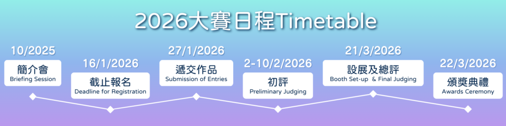 - 參賽者如未能於交件限期內 (2026年1月27日或之前) 遞交參賽項目,其參賽資格將被自動取消及不會頒發參賽證書。